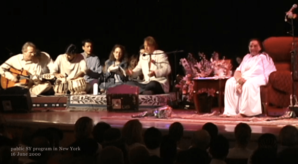 The grand climax to all the efforts, all the smiles and tears, all the obstacles and all the hopes, came far removed from the fresh, muddy reality of the Sahaja Yoga campsite: It peaked on Friday, June 23rd, 2000, in the other-worldly fable-island of New York City. The outcome of all that rehearsing was about to present itself on stage in the Big Apple. As seven p.m. approached and the ‘me-me-me’s and ‘la-la-la’s were becoming less frequent backstage, a whisper ran through the ranks: “Shri Mataji’s here!” Maybe there was never really any doubt that She, the very Heart of our inspiration, would actually come in Person. But now the sight of Her through the chinks of the stage decorations, settling down into a seat in the middle of the theater, was the hope above all hopes miraculously answered for each member of the company.